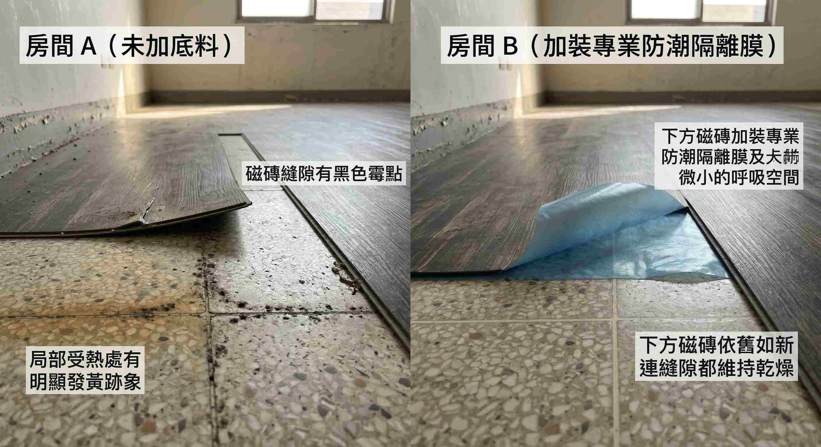 - 房間 B(加裝專業防潮隔離膜): 隔離膜有效阻絕了塑化劑與地面的直接接觸,並提供微小的呼吸空間。一年後拆除,下方磁磚依舊如新,連縫隙都維持乾燥。