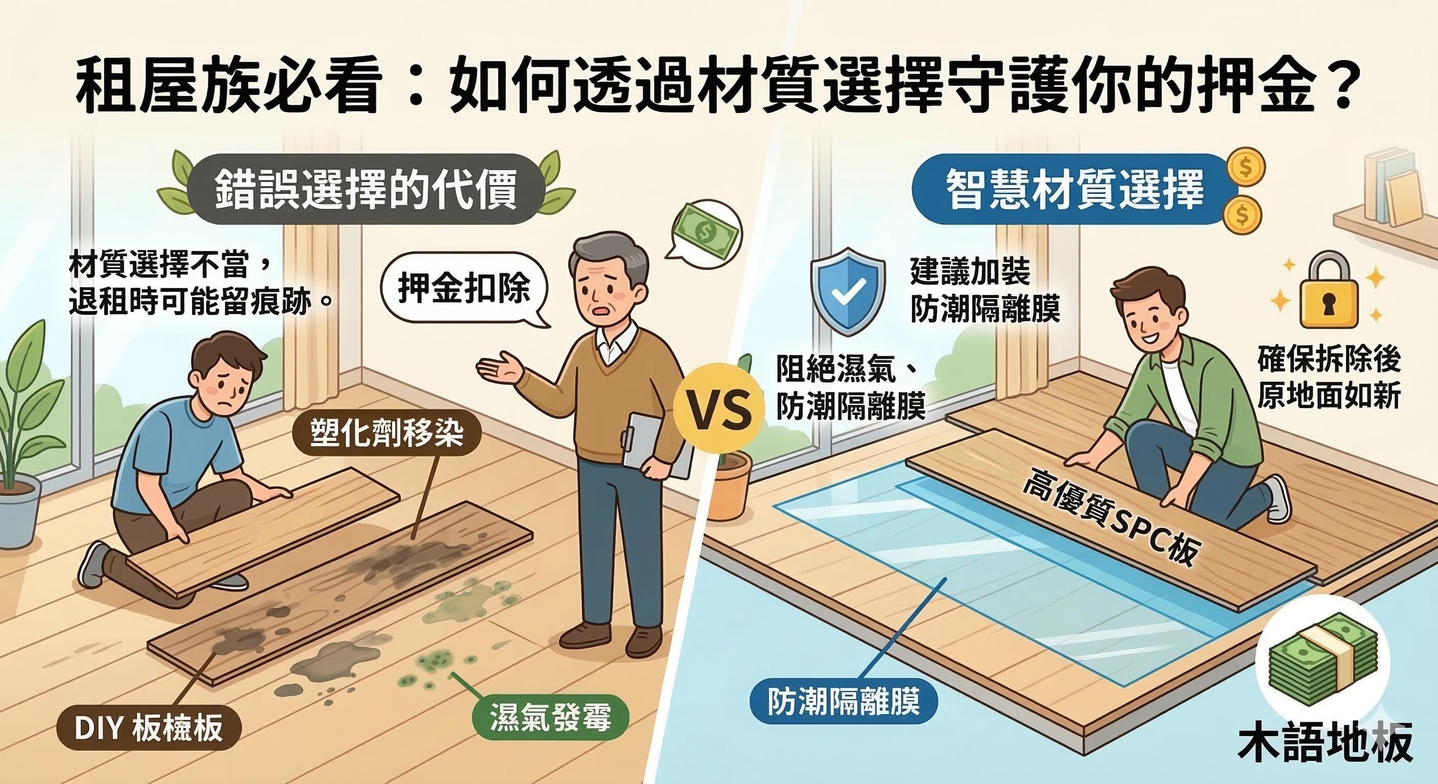 DIY 地板雖然方便,但若材質選擇不當,退租時可能面臨「塑化劑移染」或「濕氣發霉」留下的痕跡。建議加裝一層防潮隔離膜,不僅能阻絕濕氣防止地板發霉,更能確保拆除後原地面依舊如新。