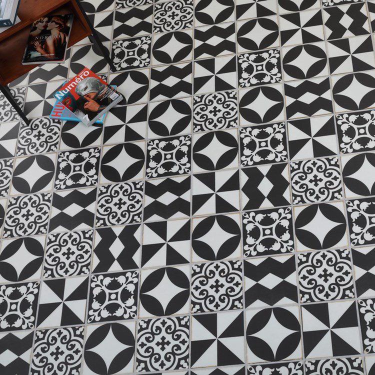 Green-Flor 的Tierra Nueva西班牙花磚系列,靈感來自於歐洲的南洋、民族風,其根本精神是不失空間自然原味與保有樸質本質。這也反映在我們的花紋設計上,以紅、藍、黑、白、灰為主色調,在地磚邊緣框,保留不規則的手工加工效果呈現出濃濃的手工感,邊緣帶有磨損、污痕設計、淡黃色的地磚底色,製造復古、自然風格的風格,呈現出地中海的室內設計特色,淡雅樸素且充滿戲劇張力,非常適用於對風格較講究的商空、辦公室,另外由於是仿磁磚效果,因此也適於居家廚房、玄關等區域。